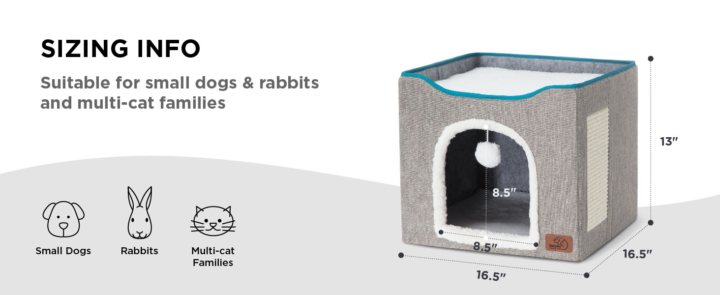 · Spacious Comfort: The cat hideout's bottom compartment measures 16.5 x 16.5 x 13", ensuring a spacious yet cozy den for cats of all ages. The top platform is larger than most brands, providing plenty of room for your cat to stretch out and get cozy.