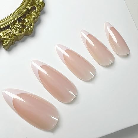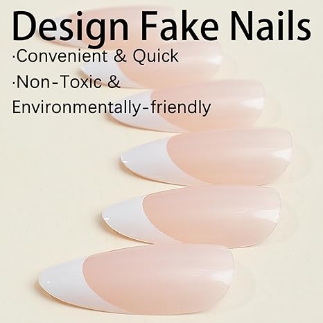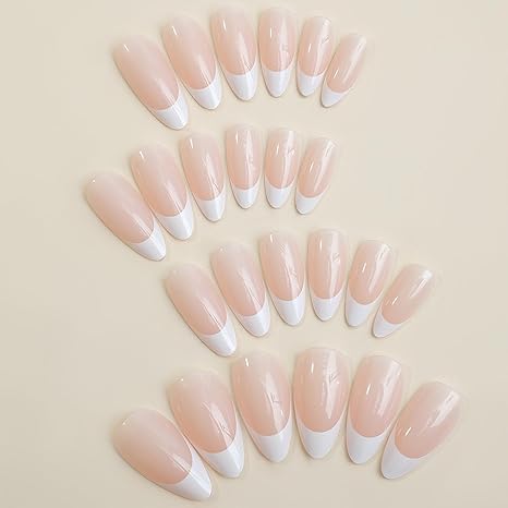 French Tip Press on Nails Medium Almond Fake Nails with Designs White French Tip False Nails Press ons Glossy Full Cover Acrylic Glue on Nails Cute Artificial Stick on Nails for Women Manicure 24pcs
